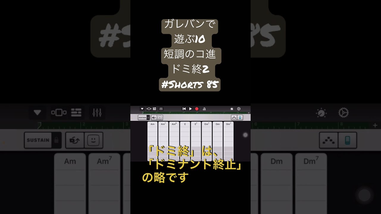 iOSガレバンで遊ぶ10 短調(この場合、Aマイナーで)の主要和音、トニック(T)、ドミナント(D)、サブドミナント(S)でのコード進行の1つめについての簡単な動画。(この記事にはYouTube動画のショート(スマホ、縦型版、現在のところ最長で60秒未満、ショート動画いわゆる「#Shorts」があります)。1つ下のところをご覧ください。