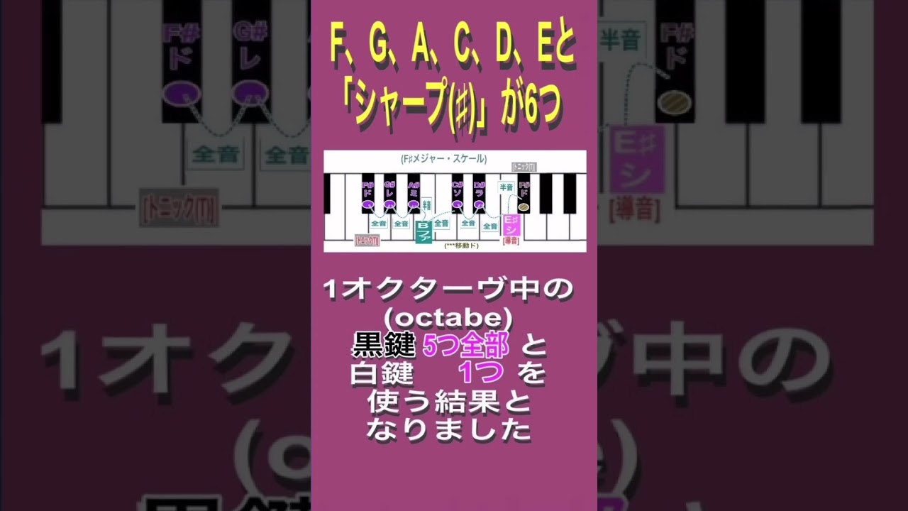 (start ) [この動画では、ガレバン(GarageBand)で弾いているところが後半にあります。] 今回は、いろいろな長調(略して、「いろ長」)の 「F#メジャー・スケール」(嬰ヘ長調)です (1)この動画では「固定ド」と「移動ド」については特にふれないものとします (今回、ある場面で少しだけ「移動ド」を使いました) (2)F#はここまで(Cの次から完全5度ずつ上げて)「シャープ(♯)が5個付いて黒鍵全てを使うB」 と進んできたので G・D・A・E・Bの次はF#ということで6つ目です (3)「F#メジャー・スケール」なので当然のように先頭にいきなりトニック(T)に#が つきます (4)それでは五線譜上でまずトニック(T)の「F#(ファ♯)」を置きます (5)トニック(T)を置いたらそこからメジャースケールの音程のパターンである 「全全半全全全半」にもとづいて五線譜上に上に階段を上がるように1つずつ書いていきます ---------------------------------------------------- 以下、動画内にない説明を追記します 「全全半全全全半」ですので、それに合わせて必要なところに#を付けます (6)1つ目「F#」と「G」は半音「シャープ(♯)」を1つ付けて「G#」に (7)「G#」で全音上がって、今度は「G#」から「A」が半音なので「A#」に (8)次は「A#」から『半音』上なので「B」のままでok (9)つづいて「B」から「C」は「半音」なので「全音」にするため#を付けて「C#」に。 (10)したがって「C#」から次は全音なので「D#」に。 (11) さらに「D#」から全音で「E#」 (12)最後の「E#」から1オクターヴ上の「F#」に行くのは導音「leading tone」の規定で半音 なので「E#」→「F#」となります (13)1オクターヴ(octabe)内の黒鍵5つ全部と白鍵1つを使って「シャープ(♯)」が6つ付きました 以下は、動画内で使用している(上記を省略した)説明です 1つずつ全音と半音をチェックして書いていくと次のようになりました (動画内の進行) --------------------------- トニック(T)は F#(ファ#→ 「移動ド」では「ド」) 半音を全音①でG# 半音を全音②でA# 半音でそのままB 半音を全音③でC# 半音を全音④でD# 半音を全音⑤でE# (1オクターヴ上へ) 導音で半音そのままF# ------------------------- 「全全半全全全半」と五線譜に記入すると「シャープ(♯)」が6つつきました (13)F、G、A、C、D、Eと「シャープ(♯)」が6つ。 1オクターヴ中のB以外全部#が付く結果となりました 次回からは「フラット(♭)」が付くメジャー・スケールの予定です