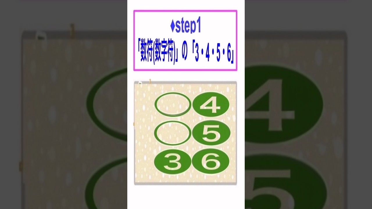 (今回の動画の説明 点字を学ぶ66 数字の「7」です 2マス使います (1) 1マス目には 「数符(数字符)」を置きます それは 「第3・4・5・6点」で (3) 「次に続くのは数字ですよ」 という意味です 「数符(数字符)」 ◯❹ ◯❺ ❸❻ (4) 2マスめは 1から9と0の数字を 『あいうるらえれりおろ』 に置き換えて 表したものにする (5) そして2マス合わせると完成です (6) 7は『対応表』 『あいうるらえ(れ)りおろ』 から「れ」です (注 : ら行は 「母音(=あ行)」+第5点 です) だから、「れ」は 「え(第1点)」+第5点」 で 「1・2・4・5点」です ❶❹ ❷❺ ◯◯ だから・・・ (7) 数字「7」は 「数符+れ」 ◯❹ ❶❹ ◯❺ ❷❺ ❸❻ ◯◯ です! できた!! 続きは次回です! (効果音・BGMはVLLO標準のものです) #Shorts